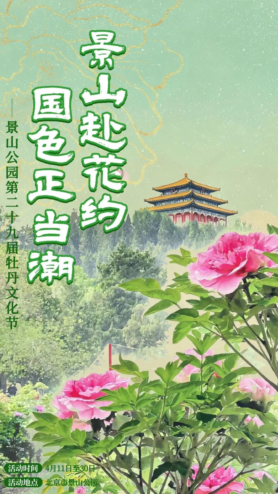 2026年景山公园第二十九届牡丹文化节,于4月11日至4月30日如约而至。本届牡丹文化节以 “景山赴花约·国色正当潮” 为主题,700余盆促培牡丹已盛放迎客。促培牡丹分布于三个门区、西区科普园南侧及科普小屋周边,涵盖“富贵满堂”“卷叶红”“蓝月亮”“乌龙捧盛”“绿幕隐玉”等近20个经典品种。