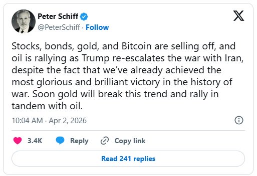 尽管出现下跌,并且在4月1日和2日因美国总统特朗普(Donald Trump)最新电视讲话引发进一步回落,美国顶级经济学家彼得·希夫(Peter Schiff)在周三晚间发表于X平台的帖子中表示,黄金走势即将出现反转。